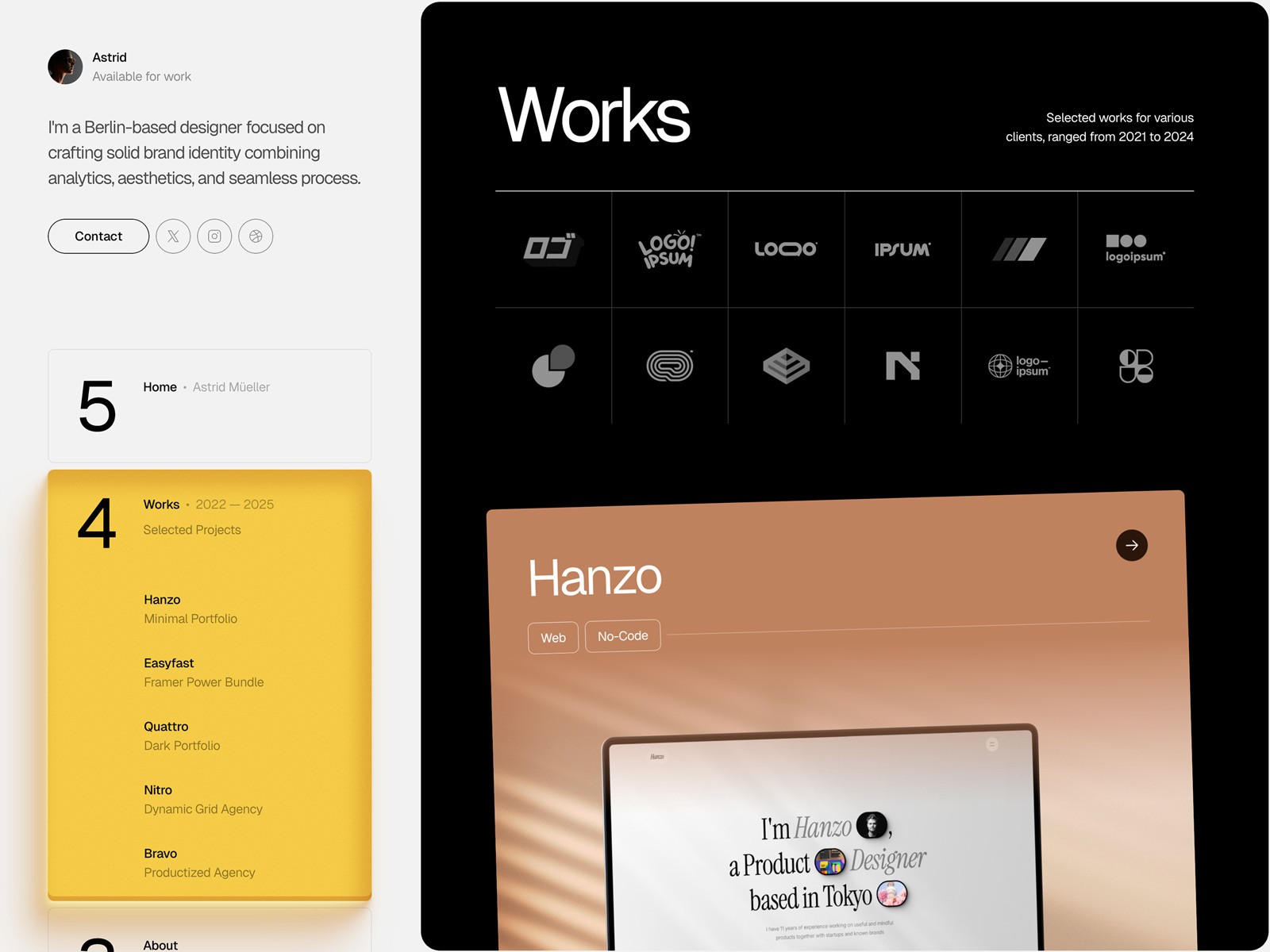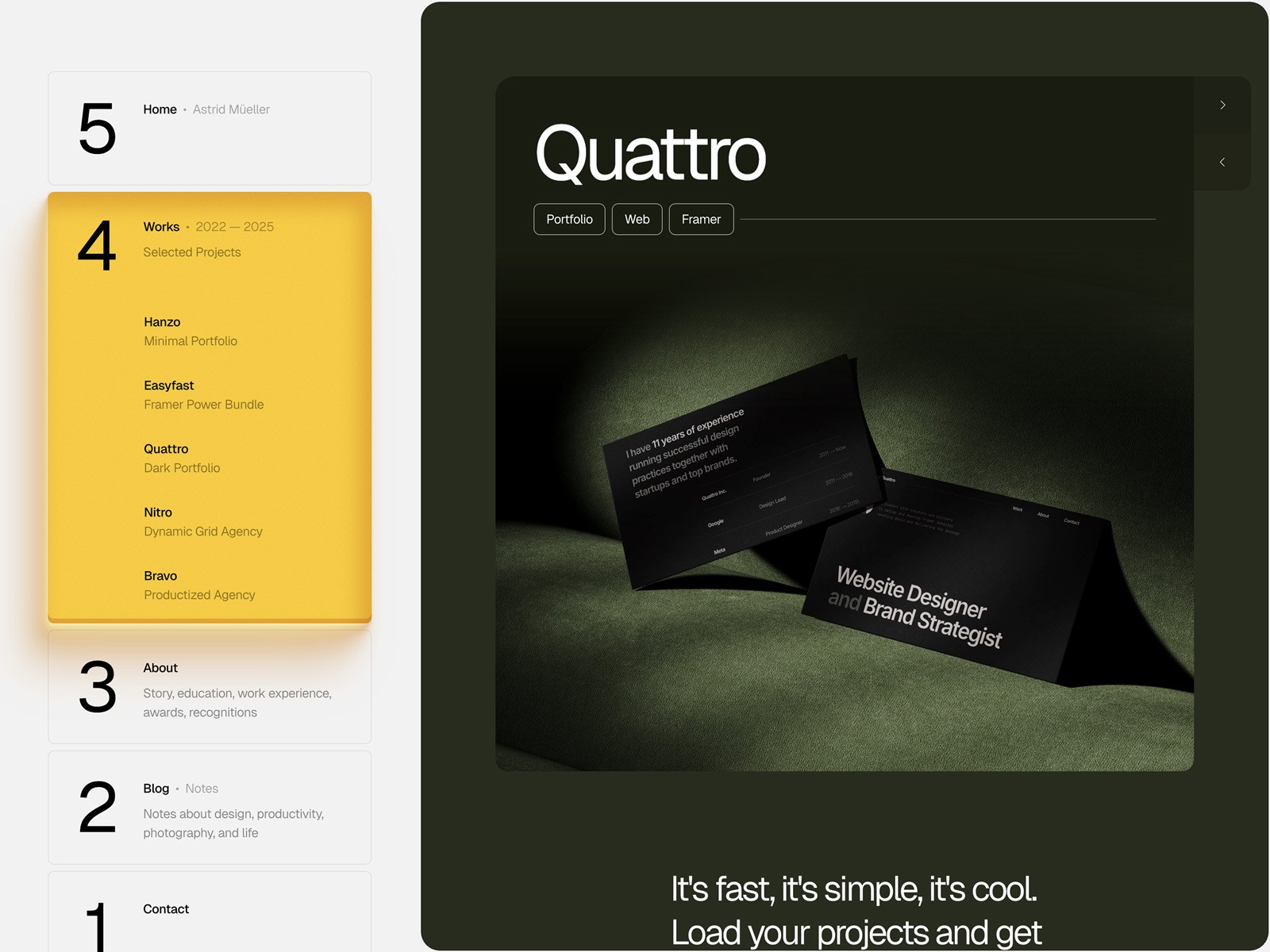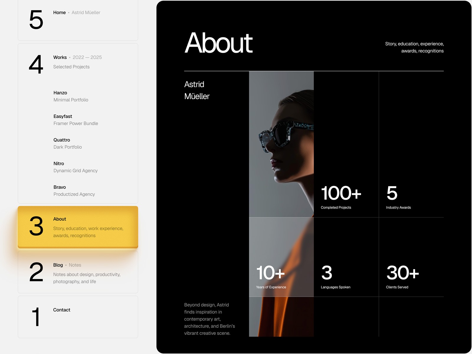 Strida offers a smooth and powerful experience when presenting your work in a full-screen format. It combines bold Swiss typography, smooth animations, sidebar navigations, flexible CMS — everything to make your portfolio rock.